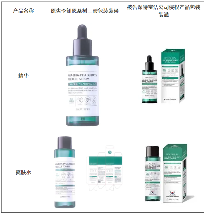 2021年原告委托c7娱乐调查发现,被告汕头市深特宝洁实业有限公司生产、销售和推广的“茶树祛痘美白补水液”“茶树香皂”等护肤品,其产品包装装潢直接抄袭、摹仿原告前述已经具有较高知名度和影响力的“SOME BY MI/莎柏蜜”茶树三酸系列化妆品和黑蜗牛精华液的包装、装潢设计,使用与之近似的标识,造成消费者混淆误认。故原告作为茶树三酸、黑蜗牛精华包装装潢权益获益人,诉至广东省汕头市中级人民法院。汕头中院认定:李知恩主张的茶树三酸、黑蜗牛精华包装装潢构成具有一定影响的包装装潢,深特宝洁公司生产、销售茶树三酸、黑蜗牛精华液的行为构成不正当竞争。因判赔额不符合原告预期,原告后上诉至广东省高级人民法院,广东省高级人民法院最终维持一审判决。